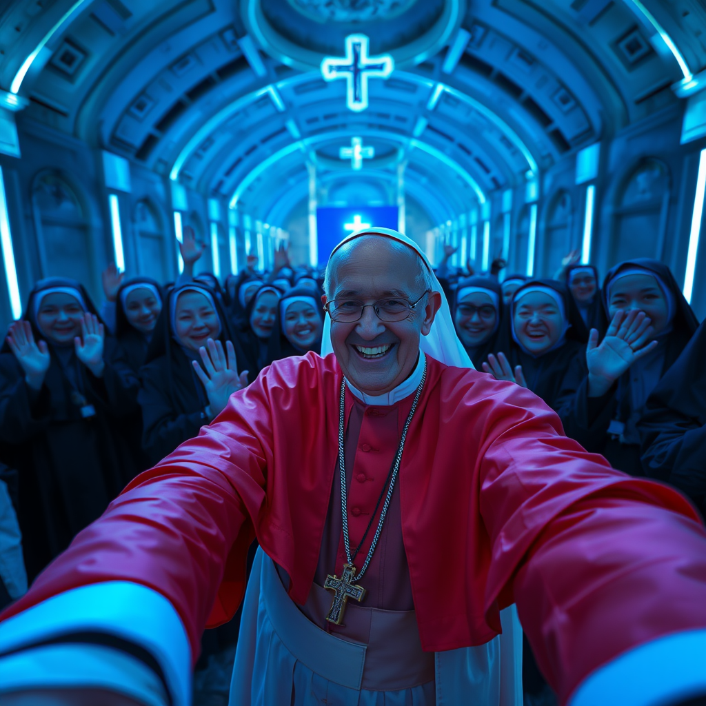 Pope Francis as a TikTok influencer taking a selfie with a group of joyful nuns waving at the camera in the background, all immersed in a vibrant black light painting environment, capturing a hyper-realistic scene in 8k resolution. The setting is illuminated with ethereal blue volumetric lighting, showcasing ultra-detailed, ultra-realistic textures and expressions. The atmosphere is lively yet reverent, infused with a playful sense of chaos and spontaneity.