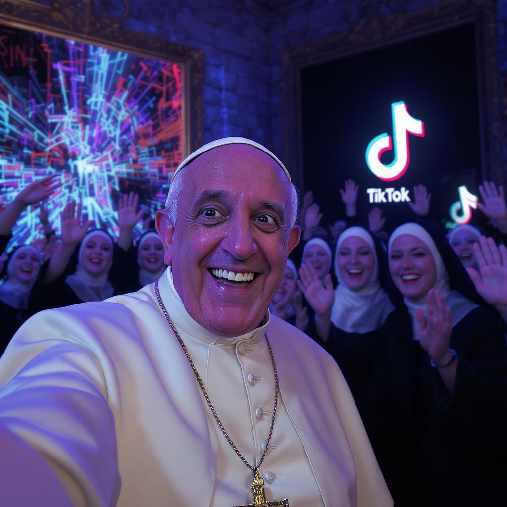 Pope Francis capturing a lively TikTok selfie with cheerful nuns waving enthusiastically in the background, set against a backdrop of vibrant black light art. The scene is bathed in ethereal blue volumetric lighting, showcasing hyper-realistic, ultra-detailed textures with an 8k resolution. The atmosphere is lively and spirited, with a touch of whimsy and modern technology blending seamlessly with traditional elements. The mood is joyful and engaging, with a sense of divine presence in the digital age.