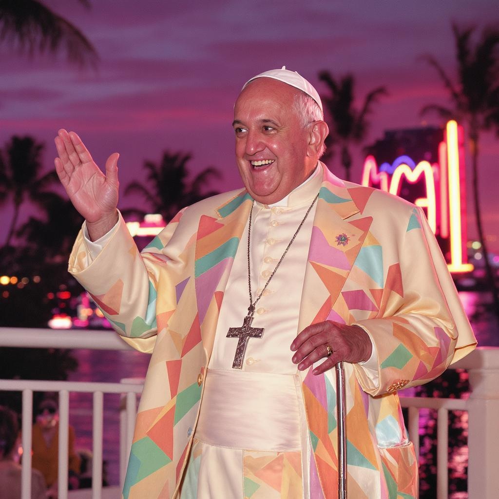 Pope Francis embracing vibrant 80s Miami style, adorned in a pastel-colored suit with bold geometric patterns; palm trees swaying in the background under a neon skyline, the atmosphere blending spiritual serenity with the lively energy of Miami's golden era, capturing an aged yet modern aura in a tall, elegant silhouette.