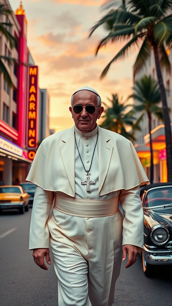 Pope Francis strolling through the vibrant streets of 1980s Miami, dressed in a pastel-colored linen suit with a crisp white shirt underneath, sporting stylish aviator sunglasses. His traditional papal hat is given a contemporary twist with a subtle tropical design. The scene is set against a bustling backdrop of neon-lit art deco buildings, vintage convertibles cruising by, and palm trees swaying under a sunset sky. The air is filled with the lively beats of Latin music, capturing the essence of Miami's iconic cultural vibe.