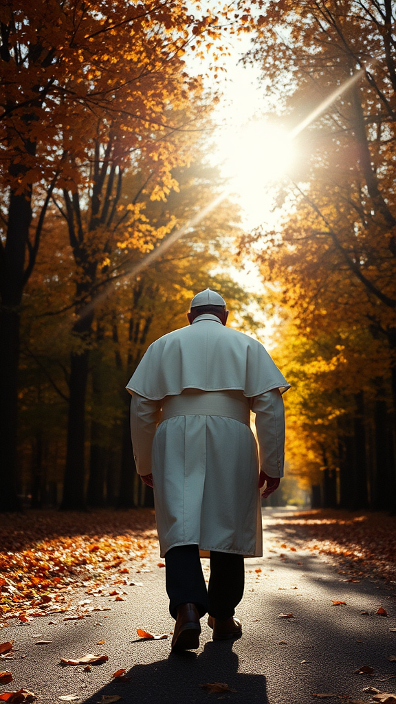 Pope Francis walking towards camera in puffy parka coat, surrounded by vibrant autumn foliage, sun shining through trees, captured on Ilford Delta 400 film, low-angle perspective.