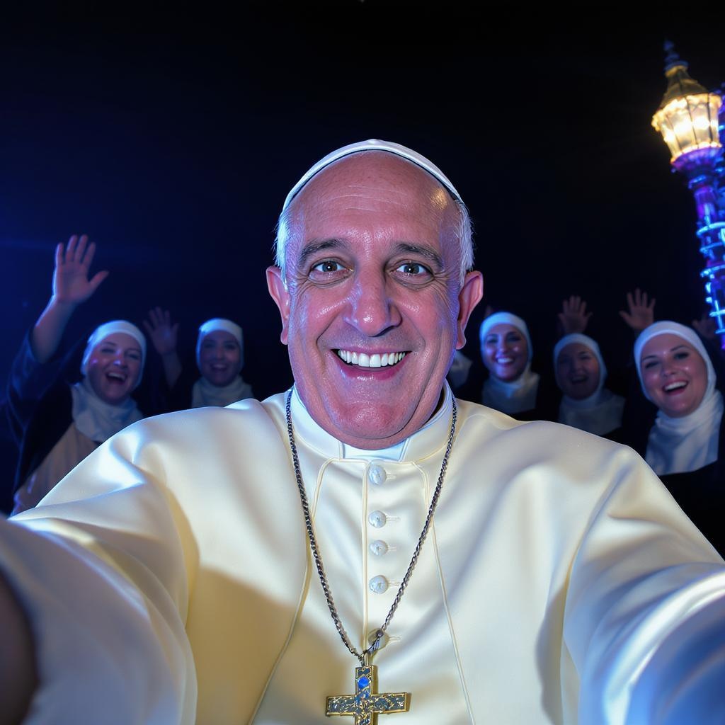 Pope Francisco as a charismatic TikTok influencer capturing a selfie, lively nuns joyfully waving at the camera in the background, a striking black light painting illuminating their surroundings, hyper-realistic 8k quality, enriched with cool blue volumetric lighting that bathes the scene, exceptionally detailed and stunningly realistic with a dash of playfulness, infused with an artistic touch of digital surrealism and gentle chaos.