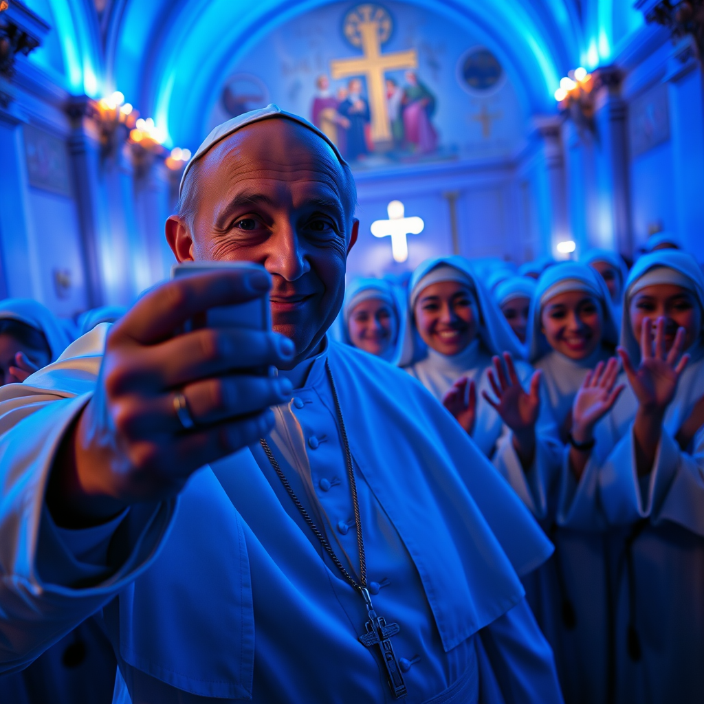 Pope Francisco as a social media influencer captures a selfie, his expression joyful and engaging as he holds the camera. Behind him, a group of cheerful nuns wave enthusiastically at the lens. The scene is illuminated with vivid black light painting, casting an ethereal glow that highlights every detail in hyper-realistic 8k. Blue volumetric lighting envelops the scene, creating an atmosphere of serenity and vibrancy. The image is ultra-detailed and ultra-realistic, portraying a dynamic blend of tradition and modernity. The environment is infused with a sense of organized chaos, bringing energy and a touch of playfulness to the composition.