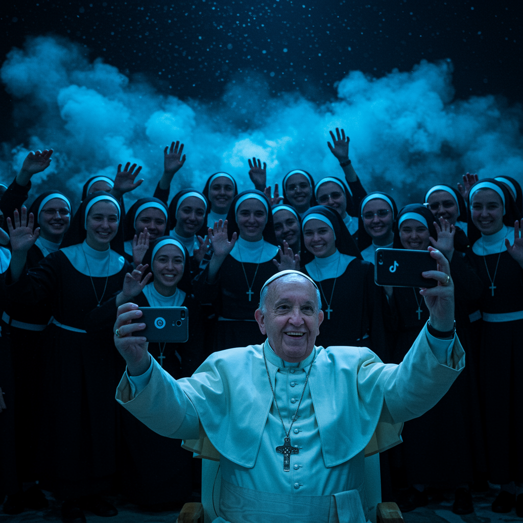 Pope Francisco joyously capturing a TikTok selfie, with a group of cheerful nuns waving at the camera in the background, all enveloped in a captivating black light ambiance. The scene is hyper-realistic and ultra-detailed, set in 8K quality, featuring ethereal blue volumetric lighting that bathes the composition in a serene glow. The setting is bustling with vibrant energy and modern flair, seamlessly blending tradition with contemporary digital culture.