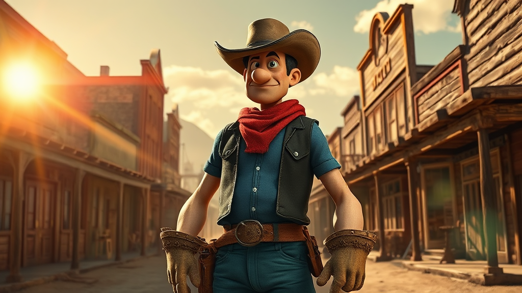 Popeye as a rugged cowboy stands confidently on an old west main street, surrounded by dusty wooden buildings under a blazing sun. The scene is a realistic masterpiece, showcasing intricate details and high-quality craftsmanship, with stunning lens flare effects reminiscent of an unreal engine digital painting. The dramatic realism is heightened by beautiful and detailed lighting, casting dynamic shadows across the landscape. The vibrant yet peculiar color palette adds a unique touch, setting off the gritty textures of Popeye's attire. Despite its energetic and complex composition, the scene remains free of blurriness or distracting elements, celebrating the aesthetics found trending on ArtStation and CGSociety.