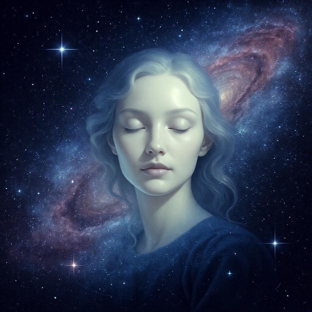 Porcelain complexion framed by the vastness of a starry cosmos, evoking a mystical ambience with intricate detail, high-definition wonderment and ethereal charm.