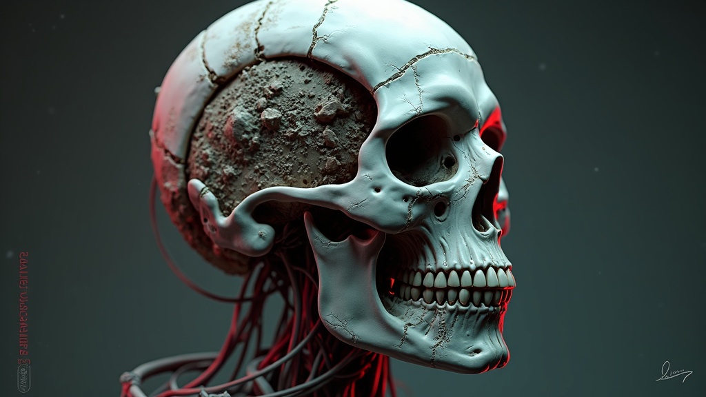 View this AI-generated image featuring an ultra detailed porcelain reaper skull android face with cyborg and robotic elements showcasing intricate parts and exquisite detailing the face features a harmonious blend of anatomical facial muscles intertwined with cable electric wires and microchips all