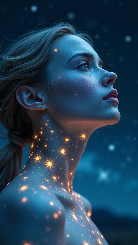 Porcelain skin glows softly under a star-studded night sky, creating an ethereal and enchanting atmosphere with hyper-detailed intricacy, capturing the magic of celestial wonders.