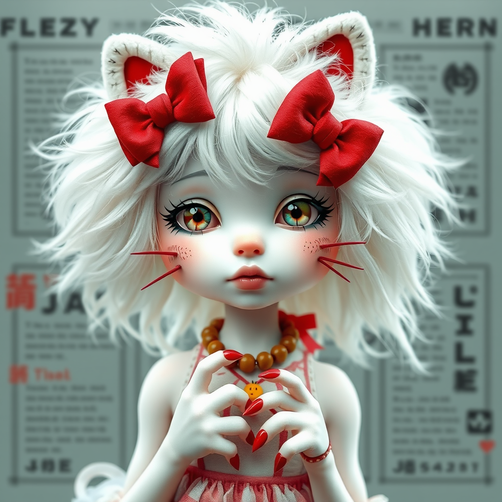 porcelain-skinned girl with fluffy white hair adorned with red bows, embodying a humanized version of hello kitty, her features exaggerated with quirky charm, playfully imperfect anatomy with whimsical hands and digits, surrounded by playful text snippets, blurry lines and a blend of quality levels, adorned with unexpected signatures and watermarks, subtly merged aesthetics of cute and monster-like, occasional glimpses of extra features like faces, conveying a unique character in a world of jpeg artifacts and creative chaos
