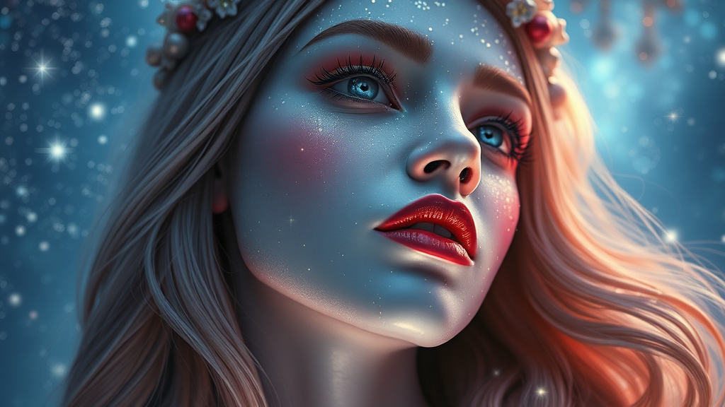 Porcelain visage shimmering under a starlit sky, capturing the essence of a celestial enchantment, hyper-detailed with magical allure, vivid and ethereal in its execution.