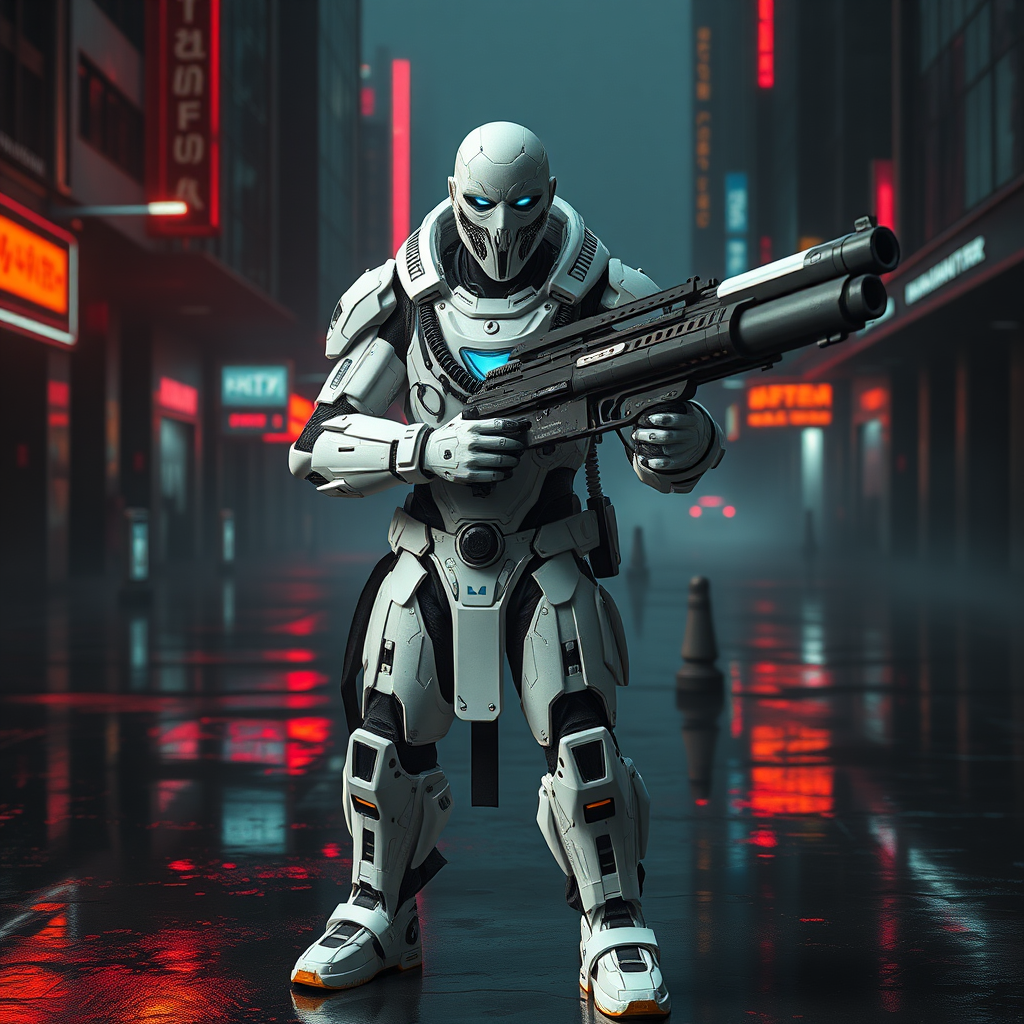 Porcelain white with blue accents and hints of gold, ultra-realistic cybernetic warrior in 8k resolution, embodying a fusion of cyborg and transhumanism elements. A futuristic warrior with a bald head and intricate mask, standing stoic in a dark dystopian cityscape where wet concrete mirrors his form. He wields a massive mecha machine gun reminiscent of Gears of War, exuding a powerful presence. The environment glows with a Blade Runner-inspired color palette, casting neon reflections and creating an otherworldly ambiance. Subtle mechanical enhancements and futuristic armor detail the figure, adding layers of complexity and depth to his imposing silhouette.