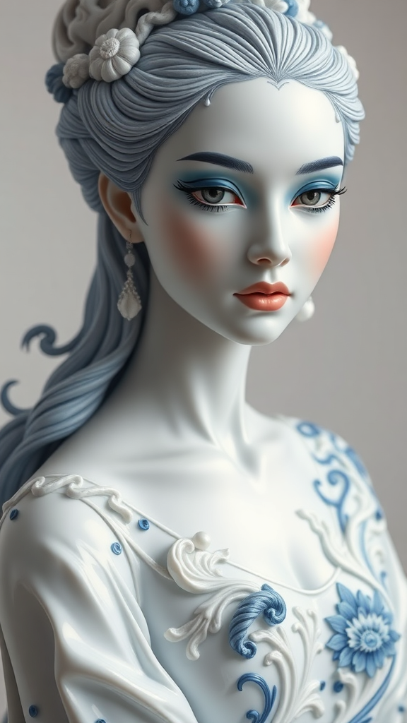Porcelain woman with intricate detail, embodying balanced symmetry in a palette of white and blue, featuring exquisitely detailed facial features and flowing organic forms, showcased through meticulous portraiture and complex patterns, characterized by a tall and elegant form with an air of ethereal grace.