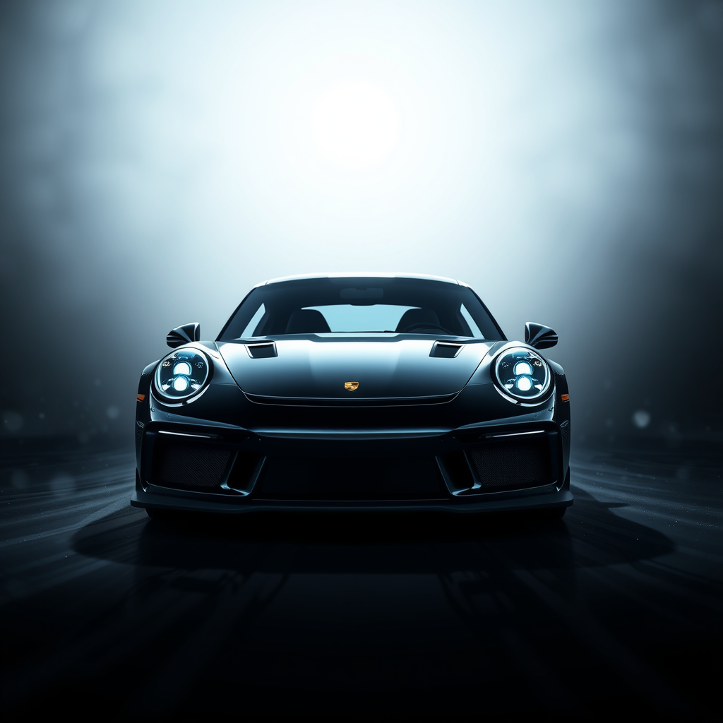 Porsche 911 in a backlit scene, featuring dynamic black, white, and blue accents. The composition is a 3D abstract digital artwork with fluid yet sharp lines, emphasizing depth of field, advanced shaders, and RTX graphics. CGI elements are enhanced by volumetric lighting and rendered in Octane for a high-impact visual—a perfect wallpaper in a 16:9 aspect ratio. The scene embraces controlled chaos and subtle intricacies, achieving a harmonious balance between realism and abstraction.