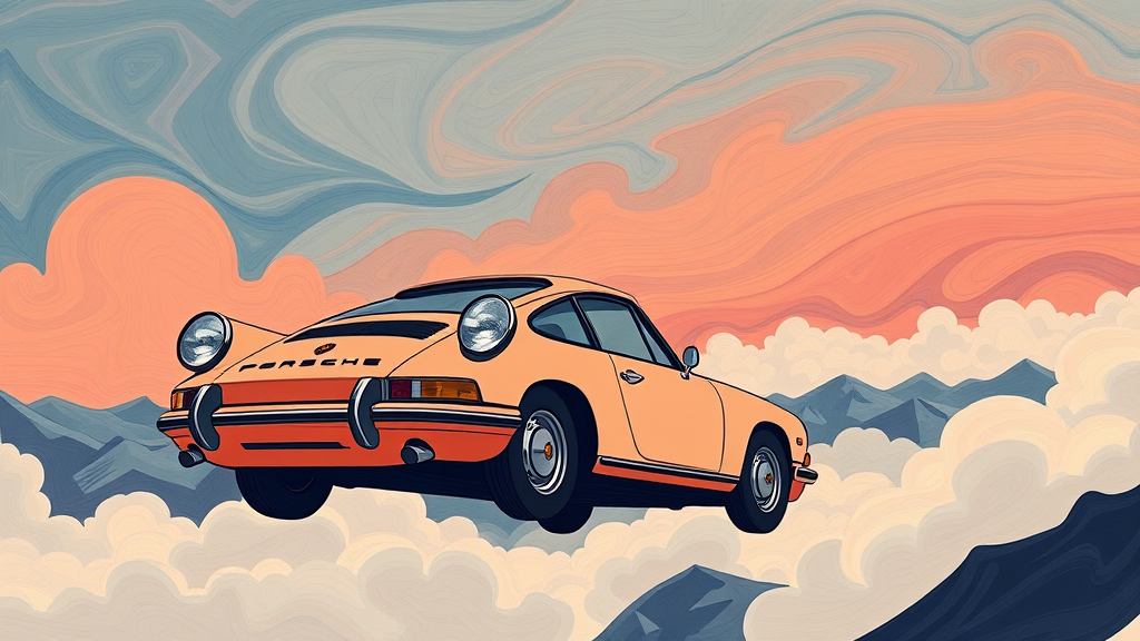 Porsche 911 naive art with skewed perspective, oversimplified shapes and bold colors, juxtaposed with a dramatic landscape of swirling clouds and nebulous mountains, as if the car is floating on air with the same ease as a child's sketch would gravity defy.