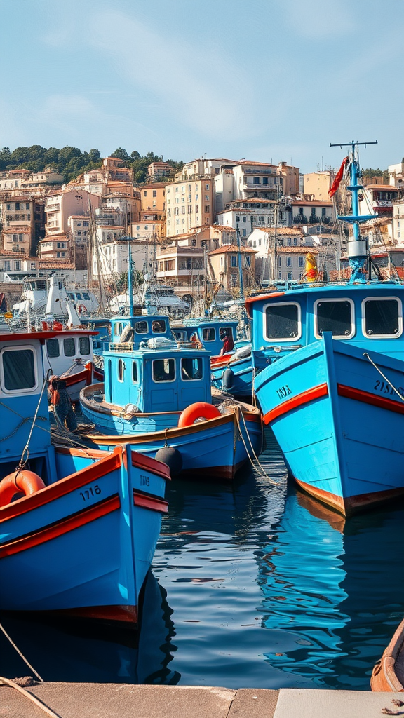 Port scene with vibrant blue fishing boats set against a city backdrop, infused with the essence of snapshot aesthetic and Claude Monet's impressionism, capturing the authentic details and spirited energy of lively coastal landscapes, featuring a soft interplay of light and shadow over the water and boats, in a tall 160:263 aspect ratio.