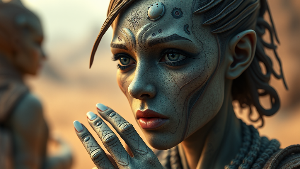 Portrait art inspired by Dune, featuring 8k ultra-realistic detail, intricate and atmospheric with vibrant colors, and cinematic lighting. The scene is trending on ArtStation, rendered in 4k resolution with hyperrealistic focus and extreme detailing. Utilizing Unreal Engine 5, the composition is a cinematic masterpiece with lumen reflections, showcasing a stunning environment in a hyperrealistic CGI style. The 3D render incorporates doll-like aesthetics, enhanced through octane rendering. Despite a backdrop of surreal realism, the artwork intriguingly plays with elements like imperfect anatomy, with blurry and fuzzy textures, adding extra limbs or fingers, and creatively exploring disfigured or mutated forms.