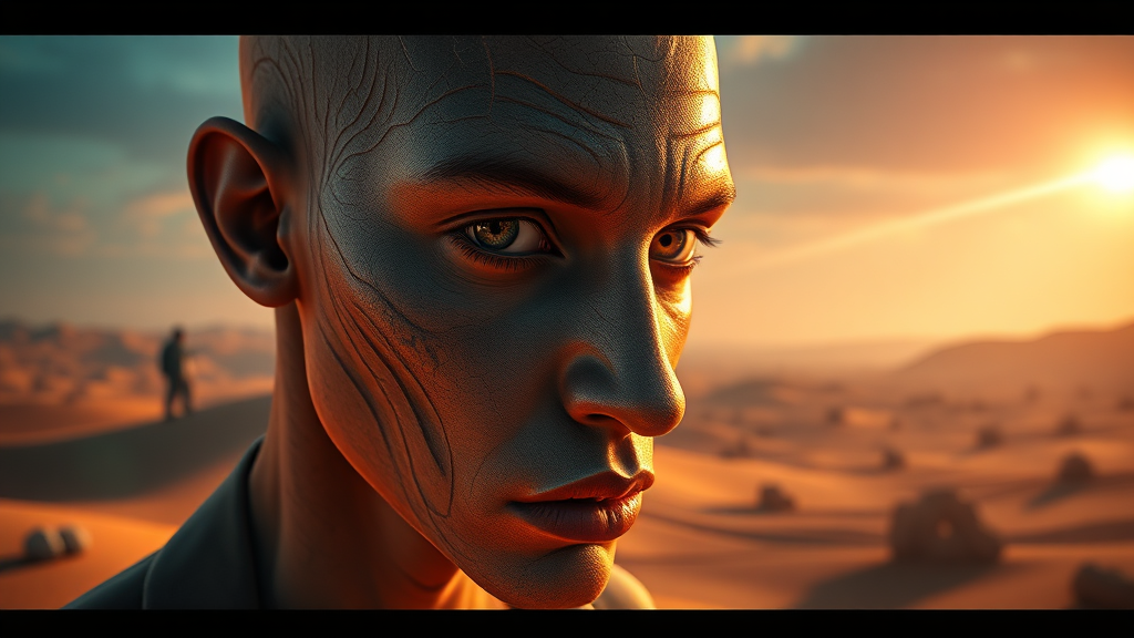 Portrait art of desert landscape, 8k hyper-realistic, lens flare, atmospheric glow, intricate and colorful details, cinematic lighting, featured on artstation, ultra high-definition, hyperrealistic focus, extremely detailed, unreal engine 5 cinematic masterpiece, dynamic lumen reflections, photography aesthetics, stunning natural environment, hyperrealism CGI, 3D rendering, dreamlike, surreal elements, imperfect anatomy, intentional blurriness, unusual features, surreal hands, distorted, abstract forms, imaginative transformations, unexpected mutations.