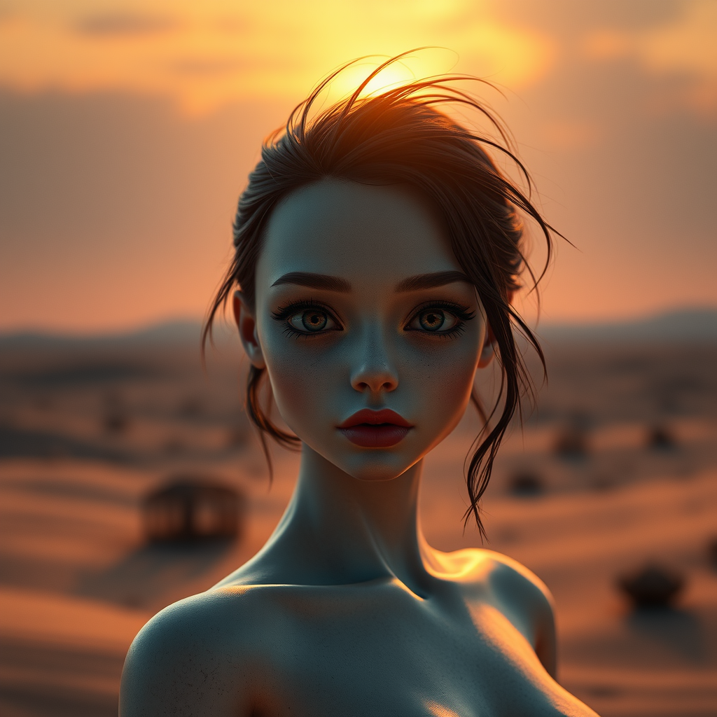 Portrait art of a desert landscape, ultra-realistic 8k resolution, featuring dramatic lens flares, atmospheric glow, and intricate details full of vivid colors. The scene captures cinematic lighting reminiscent of a trending piece on ArtStation, rendered in hyperrealistic 4k. Using Unreal Engine 5, the environment is portrayed as a cinematic masterpiece with stunning lumen reflections and photographic quality. Hyperrealism CGI techniques merge with a 3D representation, evoking the essence of a mysterious doll-like figure, yet embracing a surreal touch. The composition purposefully includes elements of imperfection, such as blurred edges, intentionally flawed anatomy, and subtly distorted features, enhancing the dreamlike quality of the scene.