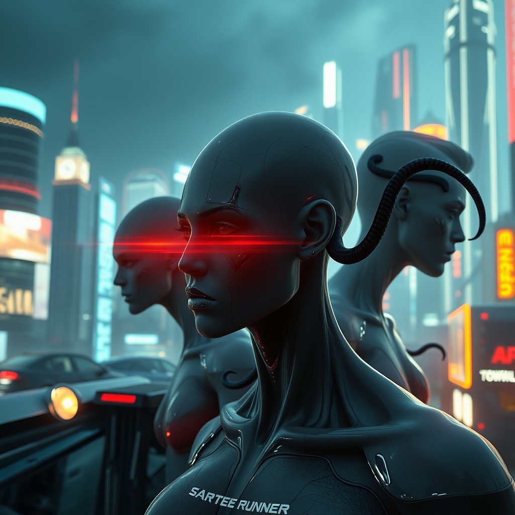 Portrait art of a futuristic cityscape in Blade Runner style, ultra-realistic 8k resolution, featuring lens flares, atmospheric glow, intricate details, vibrant colors, cinematic lighting, and hyperrealistic visuals trending on art platforms. Focused on extreme detail with Unreal Engine 5's cinematic mastery, enhanced with stunning Lumen reflections. A hyperrealism vehicle showcased, rendered in CGI and Octane, against a stunning environment. The image includes mysterious figures with stylized elements, creating a surreal and dreamlike effect, incorporating blurred and surreal anatomical features, such as multiple limbs and exaggerated proportions, adding an artistic twist to the hyperrealistic setting.