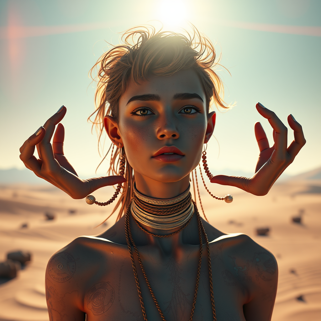 Portrait art of a surreal desert scene, 8k ultra-realistic with lens flare, atmospheric glow, and vibrant colors, cinematic lighting, highly detailed and intricate, inspired by trending art styles on ArtStation, hyperrealistic 4k resolution, focused on extreme detail, using Unreal Engine 5 for a cinematic masterpiece feel, featuring intricate lumen reflections, stunning environments, and hyperrealistic CGI elements. The scene is crafted with advanced 3D rendering techniques, employing Octane for enhanced realism. Features exaggerated anatomy such as extra arms and fingers, giving the piece an abstract and otherworldly charm, with a touch of delightful imperfection in the composition.