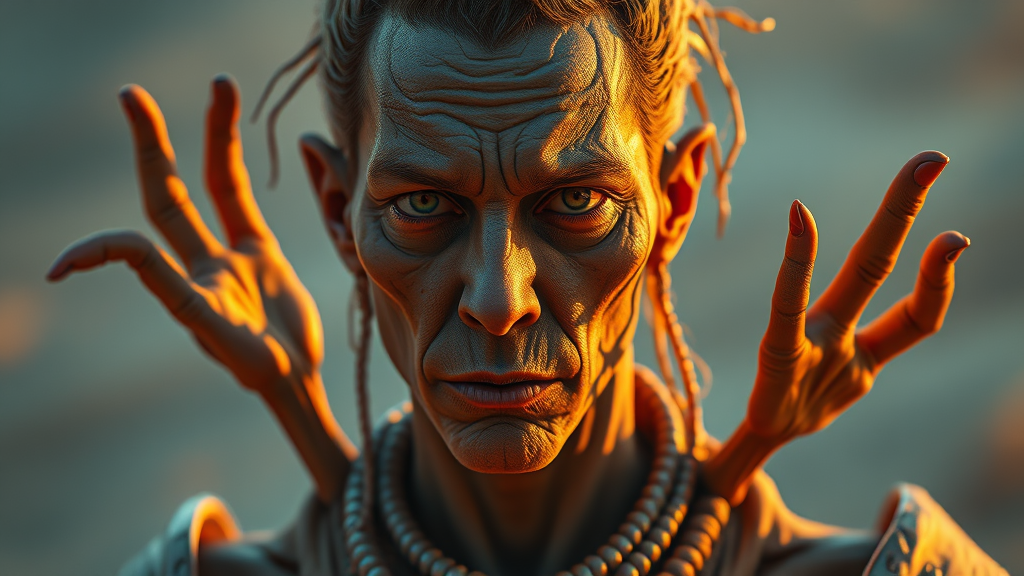 Portrait art of dune, 8k ultra-realistic, with dramatic lens flare and atmospheric glow, featuring intricate and detailed visuals full of vibrant color. Cinematic lighting, trending on artstation, 4k hyperrealism, with a focused attention on extreme details. Unreal engine 5 cinematic masterpiece, featuring lumen reflections and exceptional environmental photography. Hyperrealistic CGI utilizing 3D elements, crafted with octane render for a stunning visual experience. Features exaggerated anatomy, with fuzzy and blurry elements, showcasing additional arms and fingers, along with poorly drawn hands that are disfigured, featuring tiling textures and a sense of deformed mutation.