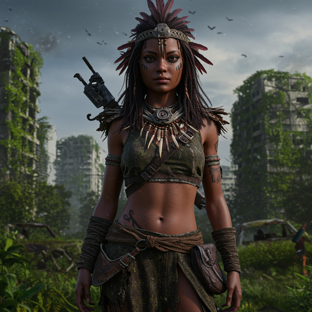View this AI-generated image featuring a striking portrait of a young and exceptionally beautiful tribal woman set against the backdrop of a post apocalyptic city now overtaken by lush verdant vegetation her presence is accentuated by a dark and gritty ambiance the scene meticulously detailed with i