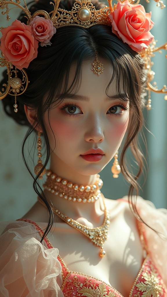 A captivating portrait of a girl as an exquisite beauty cyborg, adorned in a lavishly ornate high-fashion fantasy ensemble. The attire harmoniously blends Victorian and Chinese influences, featuring intricate veils and a Victorian dress with Chinese patterns. Inspired by the ethereal Siren from Netflix's Jibaro, the design includes couture ornamentation with gold filigree detailing. The composition is dynamic and sharply focused, with a riot of rich, vibrant colors reminiscent of a Harper's Bazaar aesthetic. The portrait embodies elegance and sophistication, evoking the style seen on ArtStation with a smooth, refined rendering. Enhanced by octane render techniques, the image features reflective and caustic effects with subtle white neon glows. Drawing on the Autochrome Pearl Portrait's essence, it incorporates Pearl Silverplate and Golden Jewelry elements for a luxe finish. The hyper-detailed proportions, styled with ultrafine precision, bring to mind the works of artists like Kim Jung Gi, Soey Milk, WLOP, Artgerm, Greg Rutkowski, and Alphonse Mucha. Utilizing Unreal Engine 5's capabilities, the scene is enriched with global illumination and radiant light, crafting a fantastical yet realistic vision of beauty. The small creative modifications lend a timeless allure, transcending the boundaries of reality and fantasy.