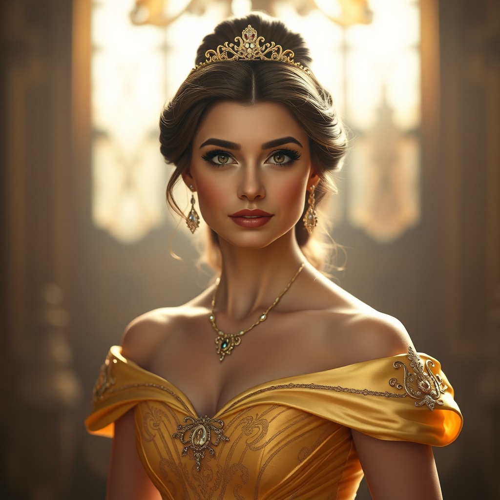 Portrait of Princess Belle, wearing an elegant golden gown, with intricate detailing, captured in 36-megapixels, 4k resolution, using an 85mm lens, crystal-clear focus, f/8 aperture, ISO 100, shutter speed 1/125, with soft, ambient backlighting, crafted as an award-winning photograph, featuring delicate catchlight, exceptional sharpness, perfectly balanced facial features, 8k quality, cinematic aspect ratio 18:32, version 5-inspired artistry.