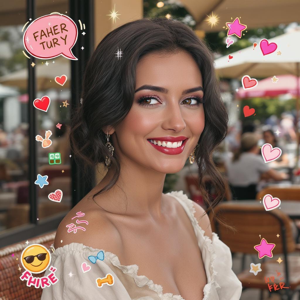 Portrait of an elegant brunette with a warm smile, finely detailed facial features, set against the lively backdrop of a summer cafe. The scene is rendered with remarkable attention to detail in concept art style, showcasing hyperrealistic and cinematic lighting. Inspired by the digital art style of Greg Rutkowski, yet with subtle abstract elements and playful additions such as colorful stickers, whimsical markings, and dynamic speech bubbles. The composition maintains high resolution and quality, avoiding any cropping, low-res artifacts, or poor anatomy, resulting in a visually captivating piece.