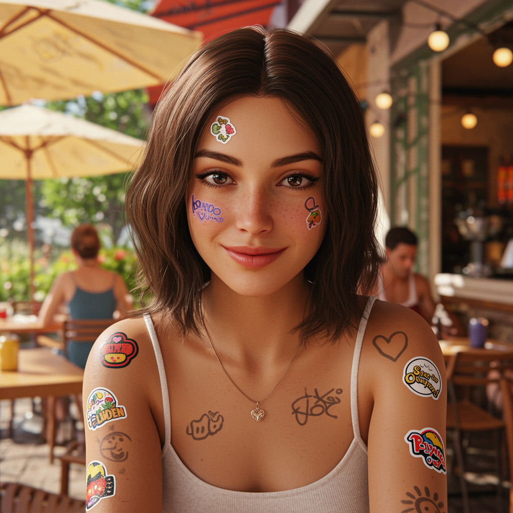 A captivating portrait of a charming brunette with a sweet smile, her face exquisitely detailed, set against the lively backdrop of a summer café. The scene embodies concept art and hyperrealism, enhanced by cinematic lighting. The digital art painting is reminiscent of Greg Rutkowski's 3D style, focusing on artistic nuances while embracing eclectic stickers, subtle markings, and playful speech bubbles. The composition is crisply detailed, prioritizing high quality and clarity, avoiding any low resolution or distracting artifacts.