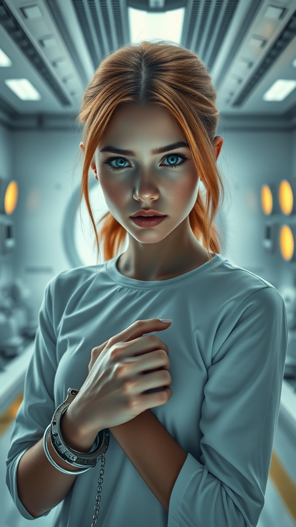 Portrait, captivating eyes, innocent expression, stunningly beautiful slender girl, intriguing pose, in sci-fi setting, girl arrested, hands cuffed, unique hair color, girl looking at the camera, in front of a futuristic white lab, with mustard colored grids and sci-fi lab equipment, high quality, ultra-high resolution, photorealistic, 8k, hyperrealistic, with Rembrandt lighting. Avoid elements like childlike features, anatomical inconsistencies, multiple heads or faces, distorted proportions, and any low-quality or unsightly visual defects. Ensure there are no watermarks, oversaturation, or unnatural distortions. Maintain the use of natural light, with a focus on round windows and a captivating, though restrained, expression.