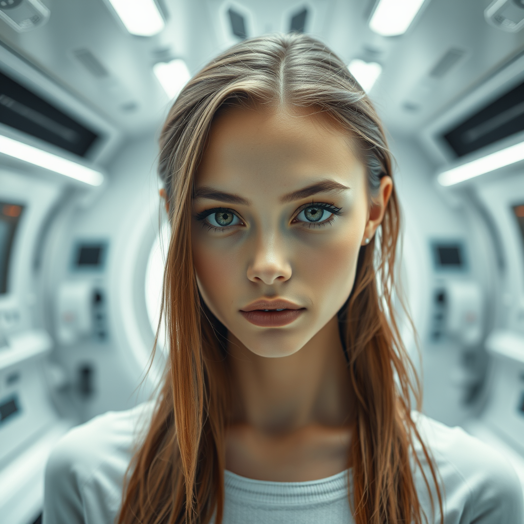 Portrait, captivating gaze, mesmerising face, innocent and expressive demeanor, extraordinarily beautiful slender young woman, luscious hair, alluring stance, set in a futuristic backdrop, direct eye contact with the camera, positioned before a sleek, sci-fi inspired white laboratory, featuring an advanced reablation capsule, exceptional quality, ultra-high resolution, hyper-realistic with Rembrandt lighting; avoid elements such as childlike features, anatomical errors, or visual distortions. Aim for photorealism and visual precision, avoiding artifacts like watermarks or oversaturated effects, ensuring a harmonious and elegant depiction.