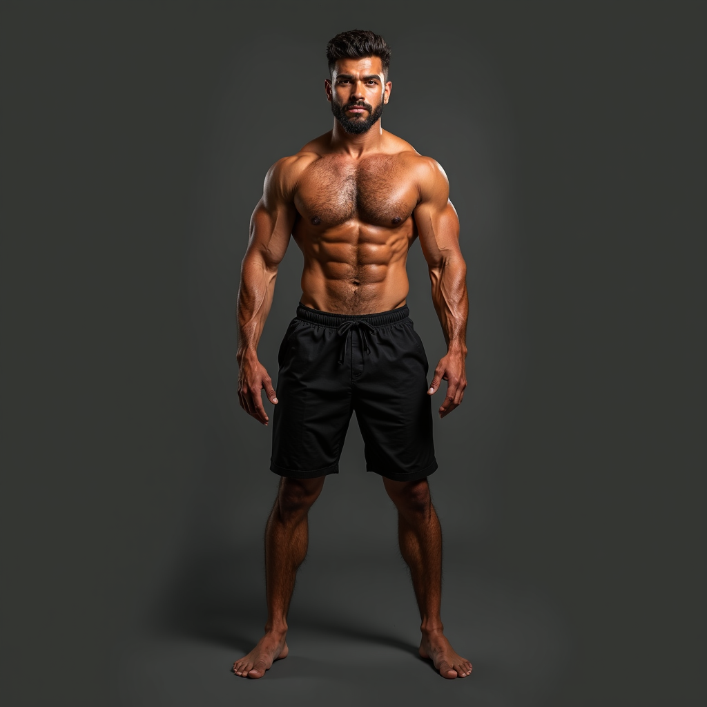 A full-length portrait capturing an athletic, strikingly handsome Cuban man with an impressive yet approachable presence standing confidently. His tall and muscular build is highlighted by strong shoulders and a solidly defined physique, including visible abs. Featuring asymmetrical eyes that add a unique charm, his rugged appeal is amplified by a beard stubble and a prominently hairy chest. He poses with ease, showcasing his toned legs and exuding masculinity and elegance. The photo is captured with award-winning cinematography and photography techniques for a photo-realistic style, offering a wide field of view to emphasize his entire body.