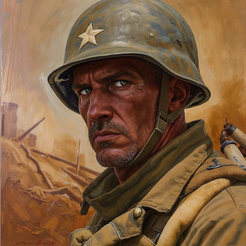An evocative portrait capturing an oblique view of a seasoned World War II U.S. Marine soldier, featuring a worn yet resilient face under a slightly tilted helmet. The painting is highly detailed, blending the artistic styles of Greg Rutkowski and Magali Villeneuve. Warm, earthy tones highlight the soldier's weathered features, telling stories of bravery and endurance. His eyes reflect determination, set against a softly blurred backdrop suggestive of a historical battleground, adding depth and context to the composition.