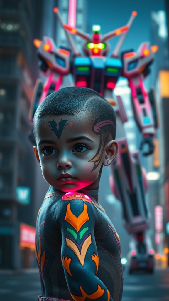 View this AI-generated image featuring a full body portrait of a small child with coatl markings intertwined with vibrant cyberpunk aesthetics set against a backdrop of a towering gundam emerging through a blurred neon lit cityscape artstation quality rendered in 8k with octane and unreal engine tec