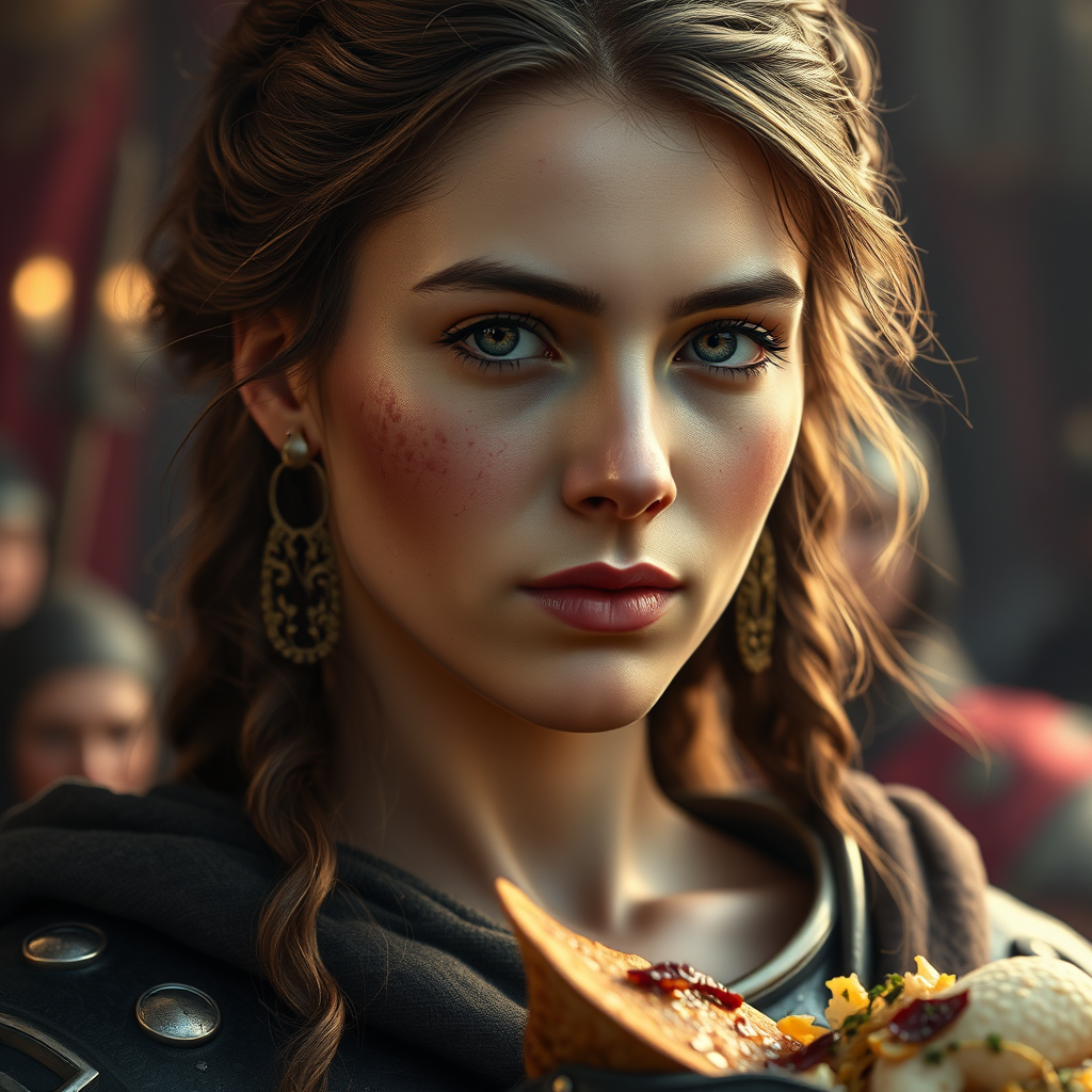 Portrait close-up of a female knight in the Middle Ages, holding a feast with highly detailed skin and stunning gradient colors. The background is richly detailed, showcasing an atmosphere of opulence. She has a closed mouth, an expression of quiet pride, and an intricately detailed face with subtle dirt smudges. Her earrings glint subtly in the ambient light. The composition is crisp and high-resolution, capturing the intricate textures and details. The scene is both vivid and immersive, bringing to life the character's strength and grace amidst a historical setting.
