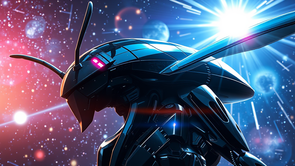 portrait close-up of a sleek Sci-fi mech with an elongated form, depicted in three quarters view, featuring a glossy black surface with intricate reflections, inspired by insectoid design. The mech boasts slender, Sci-fi insectoid wings, styled with influences from Tsutomu Nihei and Akira. Illuminated by the bright quasar light of outer space, the background is dramatic and filled with cosmic starlight, galaxy patterns, and vivid plasma rays, rendered in 8k quality for hyper-realistic detail. The setting combines anime art and manga drawing aesthetics with three-dimensional graphics. Captured with a high-resolution digital camera, evoking the precision of a Hasselblad H4D 200MS paired with a Mitakon Speedmaster 65mm f/1 lens.