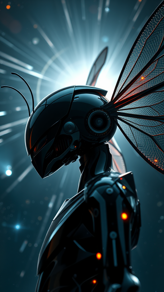 Portrait close-up of a streamlined Sci-fi mech with a slender figure in three-quarters view, featuring a glossy black reflective surface with detailed insectoid elements. The design includes Sci-fi insectoid wings and an insectoid style that draws inspiration from Tsutomu Nihei and Akira. The scene is set against a bright quasar light in outer space with a dramatic background, captured in three-dimensional graphics resembling anime art and manga drawing. Cosmic starlight and galaxy elements are highlighted with plasma rays in 8K UHD, rendered in a hyper-realistic style as if shot with a digital Hasselblad H4D 200MS camera using a Mitakon Speedmaster 65mm f/1 lens. Small creative enhancements include an enhanced luminescent glow on the wings and a more intricate pattern on the mech's surface, adding depth to the already dynamic composition.