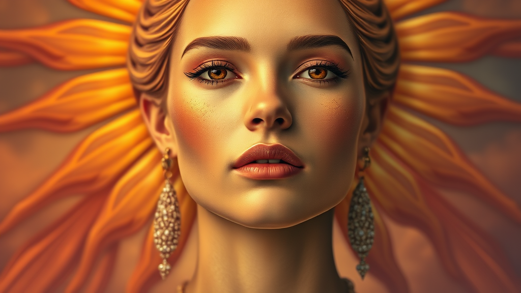 Portrait close up of a sun goddess in a heavenly setting with highly detailed skin, looking directly at the viewer. The image features a stunning palette of gradient colors in both the foreground and background, emphasizing the godly atmosphere. Her expression is serene with a closed mouth, showcasing intricate details that highlight her divinity. The background is beautifully detailed, complementing the theme of heaven. She is adorned with shimmering earrings, and her skin has natural undertones suggesting a slightly weathered appearance. The portrait focuses solely on her face, retaining the essence of a masterpiece without digital blemishes such as blurriness or artifacts. The composition is balanced, capturing a unique sense of divine elegance with a slightly elongated neck, framing a truly celestial figure.