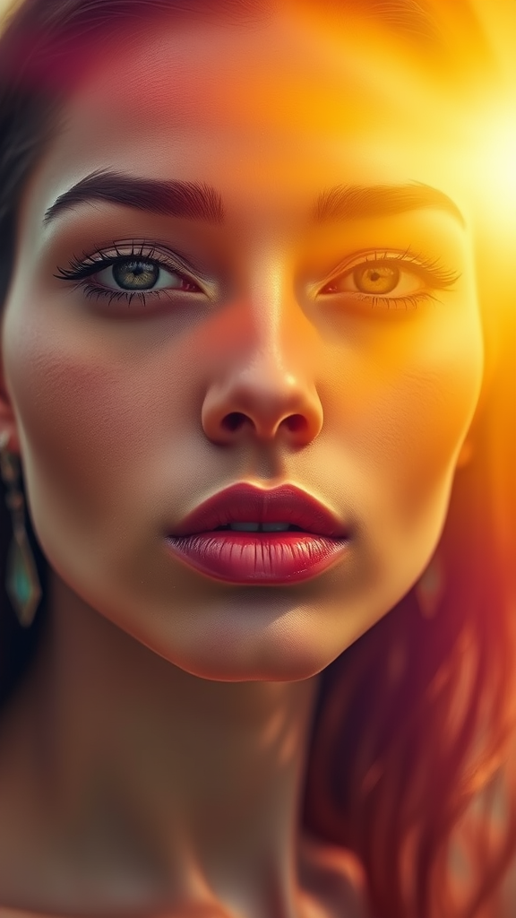 portrait close up sun goddess heaven highly detailed skin looking at the viewer vibrant gradient colors detailed background ethereal closed mouth incredibly detailed absurdres HDR elements earrings slightly weathered face defined nose cropped clear image no text or artifacts multiple angles reference long elegant neck