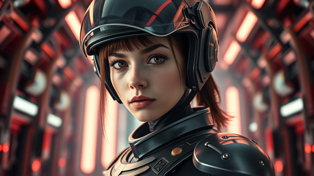 Portrait close-up three-quarter in focus of a striking young woman with a delicate, athletic build in a dynamic action pose. Her expression is both frowning and innocent, highlighting her expressive features. She is adorned in an advanced combat exo-armor suit equipped with a closed system breathing mechanism. Her helmet is a compact sci-fi design with a high-tech, glossy, transparent visor that provides cinematic lighting to her face. The backdrop is reminiscent of the intricate interiors from TV show The Expanse, featuring neon and volumetric lighting that add depth and atmosphere. The scene is captured with a Canon EOS 5D Mark IV DSLR at aperture f/8, shutter speed 1/250 sec, ISO 100, ensuring super detailed, hyper photorealistic quality with natural reflection textures. Her hair, styled in a tail with strands sticking out, adds to the cinematic effect, while the room’s illumination and symmetry contribute to the overall visual impact. She possesses a slender figure with narrow hips, clad in armor with gold accents and riveted details. Creative focus is on achieving a visually stunning, lifelike depiction without any anatomical distortions or quality issues, ensuring a refined, high-detail image.