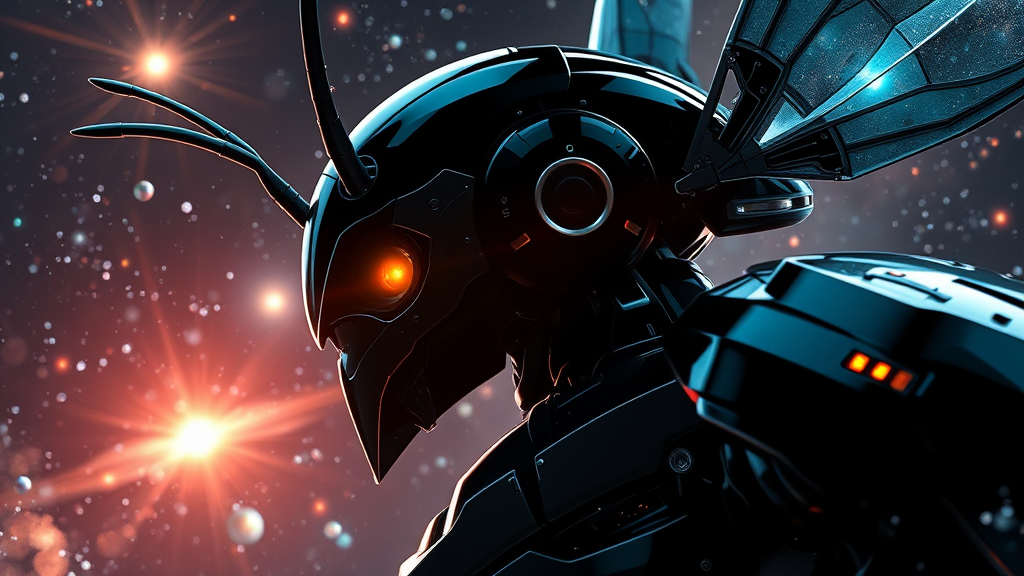 Portrait close-up, ultra-epic, futuristic streamline Sci-fi mech, elegant silhouette in three quarters view, glossy black reflecting highly detailed insectoid Sci-fi mech, Sci-fi insectoid wings, insectoid aesthetics, reminiscent of Tsutomu Nihei and Akira styles, radiant quasar illumination, deep space, intense backdrop, 3D rendering, anime art, manga-inspired sketch, cosmic starry ambiance, galaxy presence, bursts of plasma, 8k resolution, ultra-high definition, hyper-realistic quality, captured with a digital Hasselblad H4D 200MS, Mitakon Speedmaster 65mm f/1, maintaining essence while incorporating creative variations.
