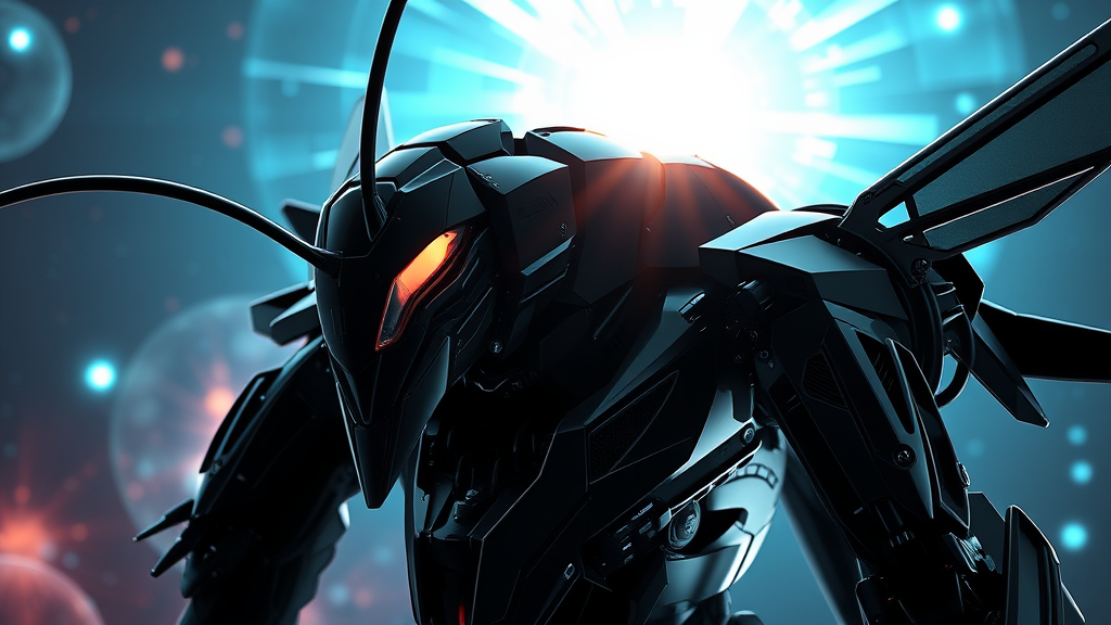 portrait close-up, ultra epic, sleek Sci-fi mech, elegant silhouette in three quarters, high-gloss black reflective intricately detailed insectoid Sci-fi mech, Sci-fi insect-like wings, insectoid aesthetic, style Tsutomu Nihei and Akira, intense quasar light, cosmic backdrop, dynamic background, 3D rendering, anime-inspired art, manga illustration, cosmic starlight, galaxy swirls, plasma beams, 8k resolution, UHD, hyper-realistic, captured with Hasselblad H4D 200MS digital camera, Mitakon Speedmaster 65mm f/1 lens, make subtle creative adjustments while keeping the essence intact