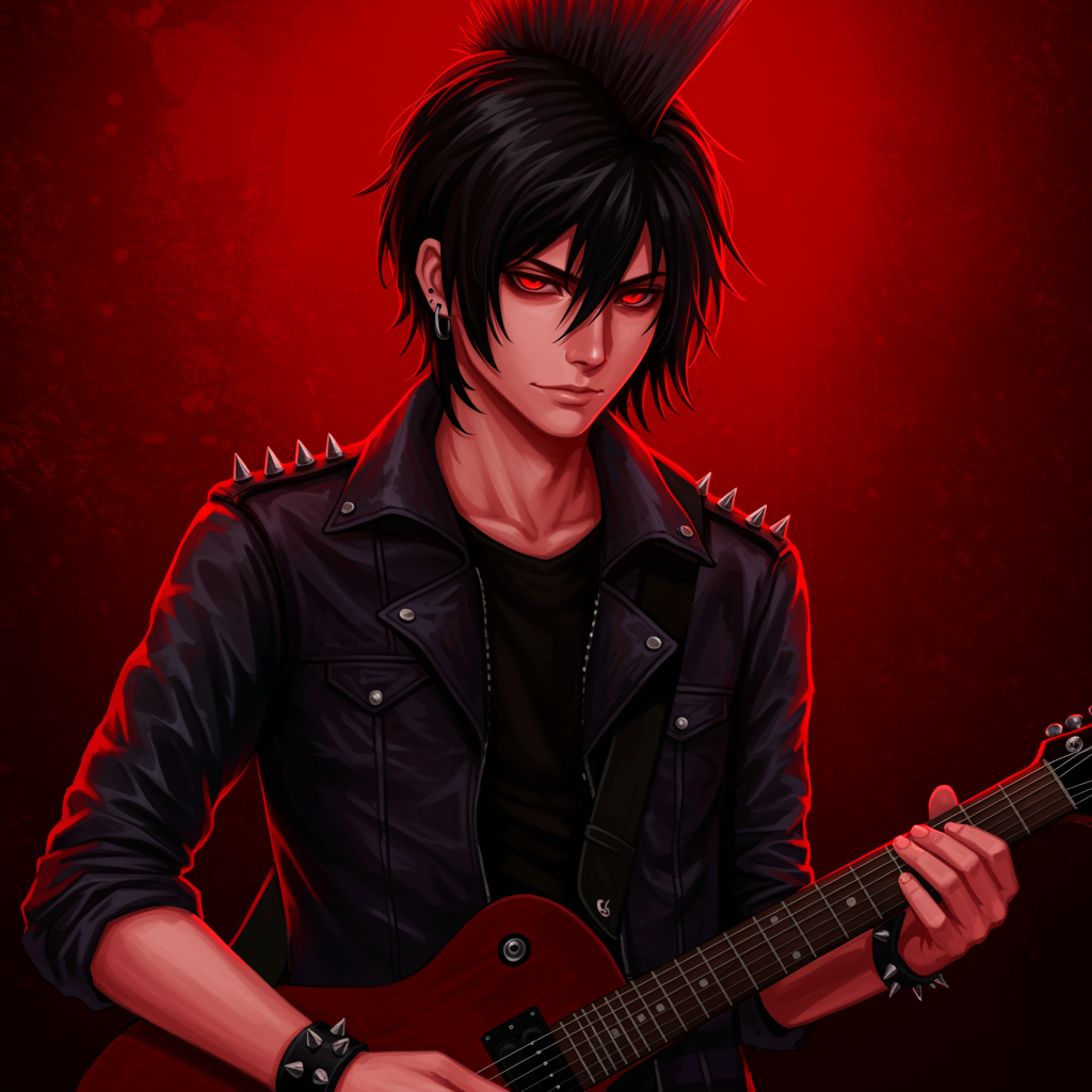 View this AI-generated image featuring a captivating portrait of a stoic drypoint anime boy with a sleek electric guitar embodying the spirit of rock music he has edgy spikes in his punk inspired wristband and dark black hair cascading over his forehead exuding a cool collected attitude the portrait