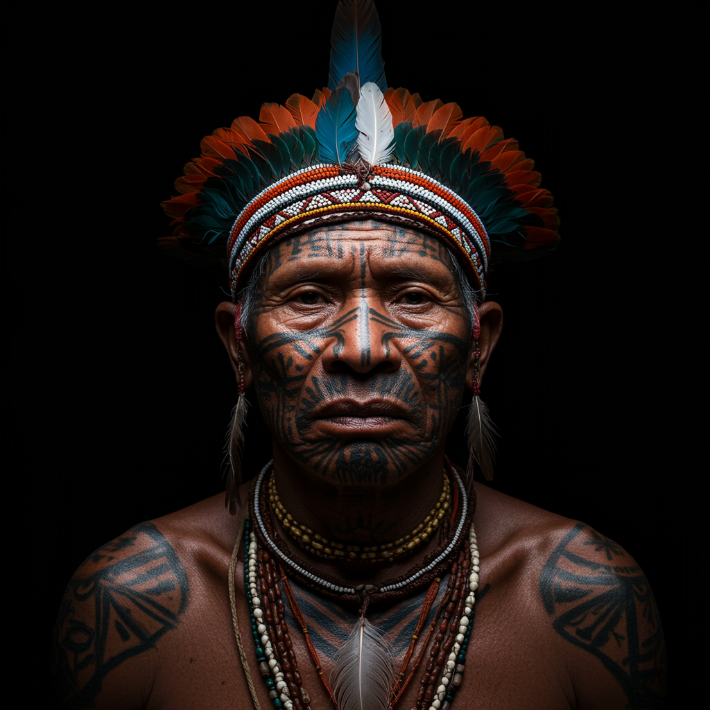 View this AI-generated image featuring a striking portrait of a tribal elder with intricate face tattoos captured with the yang08k style in top quality photography set against a solid black background the image exudes a sense of grandeur and beauty with vibrant colors that elevate the realism of the