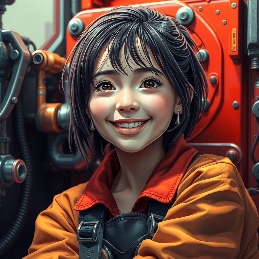 A captivating portrait of a young, energetic female mechanic, sitting contently in a highly detailed dystopian mechanical interior. Her expression is one of joy and innocence, captured through a beautiful, detailed rendering of her face, eyes, nose, mouth, and lips. The environment around her is intricately designed with vibrant colors, featuring ultra-detailed mechanical tools like a wrench and screwdriver as accessories. Inspired by the cinematic styles of "Ghost in the Shell," the setting conveys a sense of a futuristic, industrial world. The composition is further enriched with a focus on her enthusiasm and skill in a vivid 2D digital illustration. Despite the complex and immersive heavy metal surroundings, her youthful exuberance shines through, creating a stunning and masterful visual narrative.