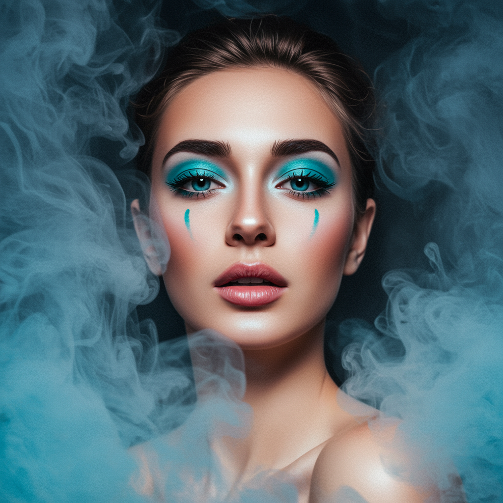 Portrait of a woman enveloped in a swirling mist of smoke, with dynamic cyan accents and makeup, delicate pastel undertones, exuding an aura of mystery and allure, her expression captivating and sultry, conveyed in a stunning oil painting style, blending modern artistic aesthetics with hyper-realistic details.