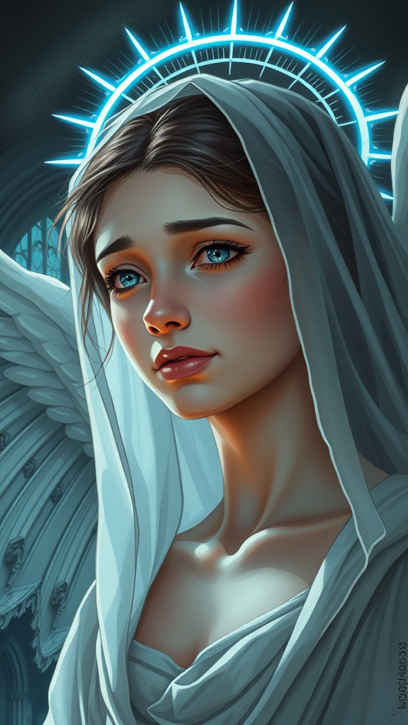 Portrait, epic realism, angelic figure, deeply sad expression, radiant halo, inspired by Alexandre Cabanel, delicate veil, old cathedral backdrop, soft neon lighting, 3D influence, sketch style, blue eyes, classic painting essence, subtle anime touch, hints of cartoon, normal quality, maintaining natural anatomy and features.