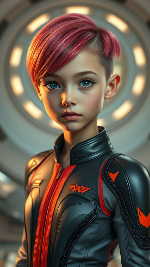 Portrait, expressive and captivating eyes, exquisite face, innocent and naive expression, remarkable beauty of a young slender girl, trendy haircut, vibrant hair color, wearing a sleek jumpsuit made from the finest sci-fi material with futuristic elements, set against a backdrop of a high-tech sci-fi room, exceptional quality, ultra-high resolution, photorealistic, 8k, hyperrealistic, Rembrandt-inspired lighting, avoiding deformations, ensuring correct anatomy, harmonized proportions, a single face, precise details, well-drawn features, natural expressions, avoiding any disfigurations or additional limbs, polished finish, sharp focus, hydrated appearance, ideal proportions, singular and distinct face, authentic hands, avoiding watermarks or artifacts, accurate representation, subtle and balanced lighting, natural ambiance, circular architectural features, harmonious expression.