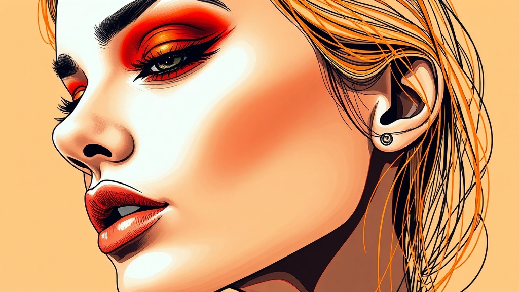 A captivating portrait of a woman's face featuring vivid red eyeshadow, rendered in bold, colorful lines with shades of dark beige and orange. The artwork showcases flawless line work, with an edgy and raw style, as if crafted from wire. The composition captures the essence of striking aesthetics and vibrant expression, maintaining an abstract yet lifelike quality.